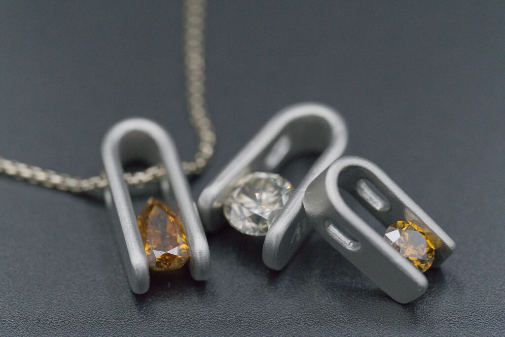 Jeder Schmuckanhänger wird in der Schweiz mit viel Handarbeit, individuell aus einem Edelmetall-Rohling auf den Diamanten angefertigt. Bevorzugt aus Platin, da dieses Edelmetall eine höhere Härte als Gold besitzt und den farbigen Diamanten in voller Pracht erscheinen lässt. Das Schmuckdesign angemeldet beim schweizerischen Patentamt.