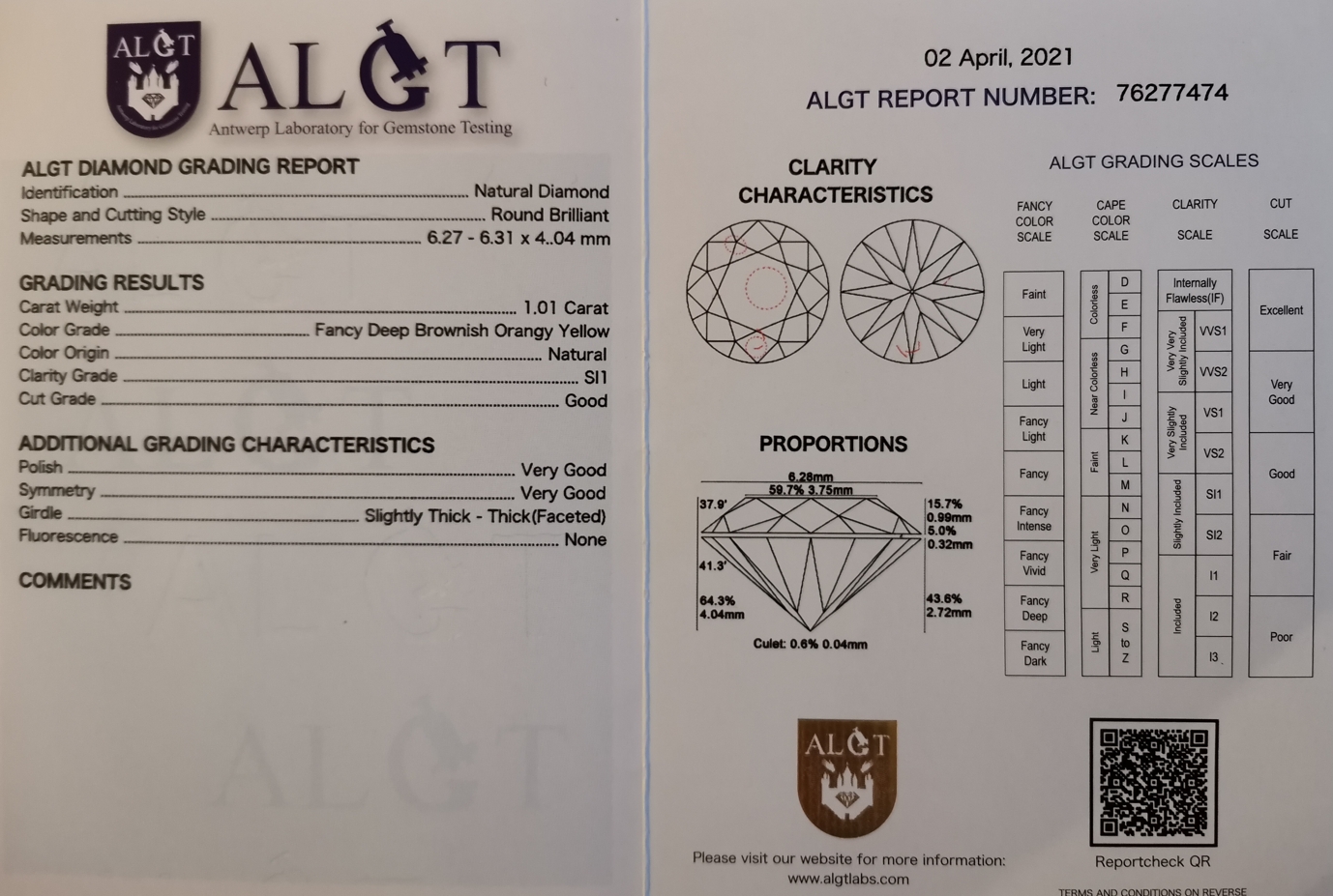 Naturdiamant, bräunlich-Orange-Gelb, 1.01 Karat CHF 4'750.00 inkl. MWST Artikel-Nr. 1107 In den Warenkorb Karat: 1.01 Reinheit: SI1 Zertifikat: Download